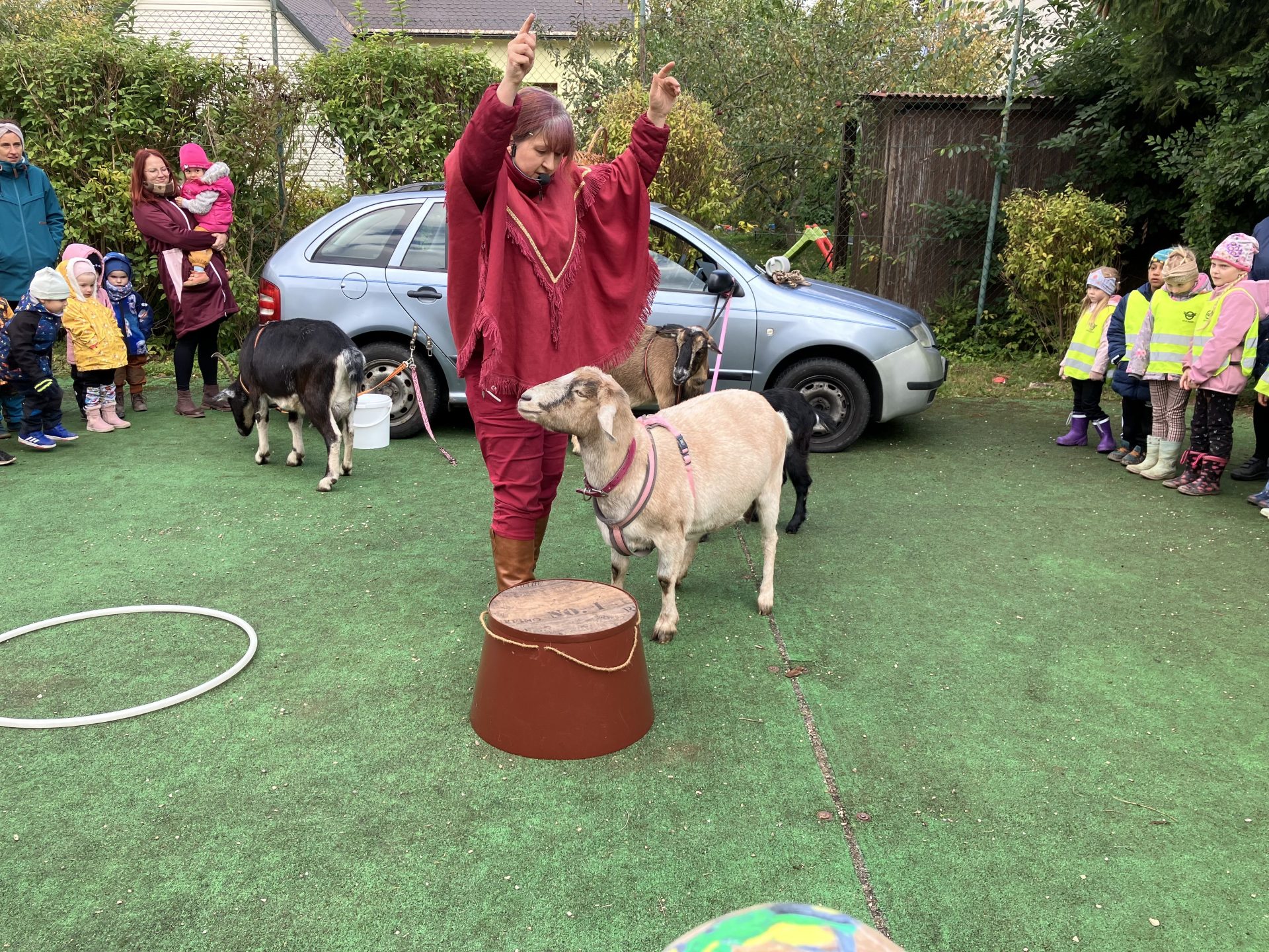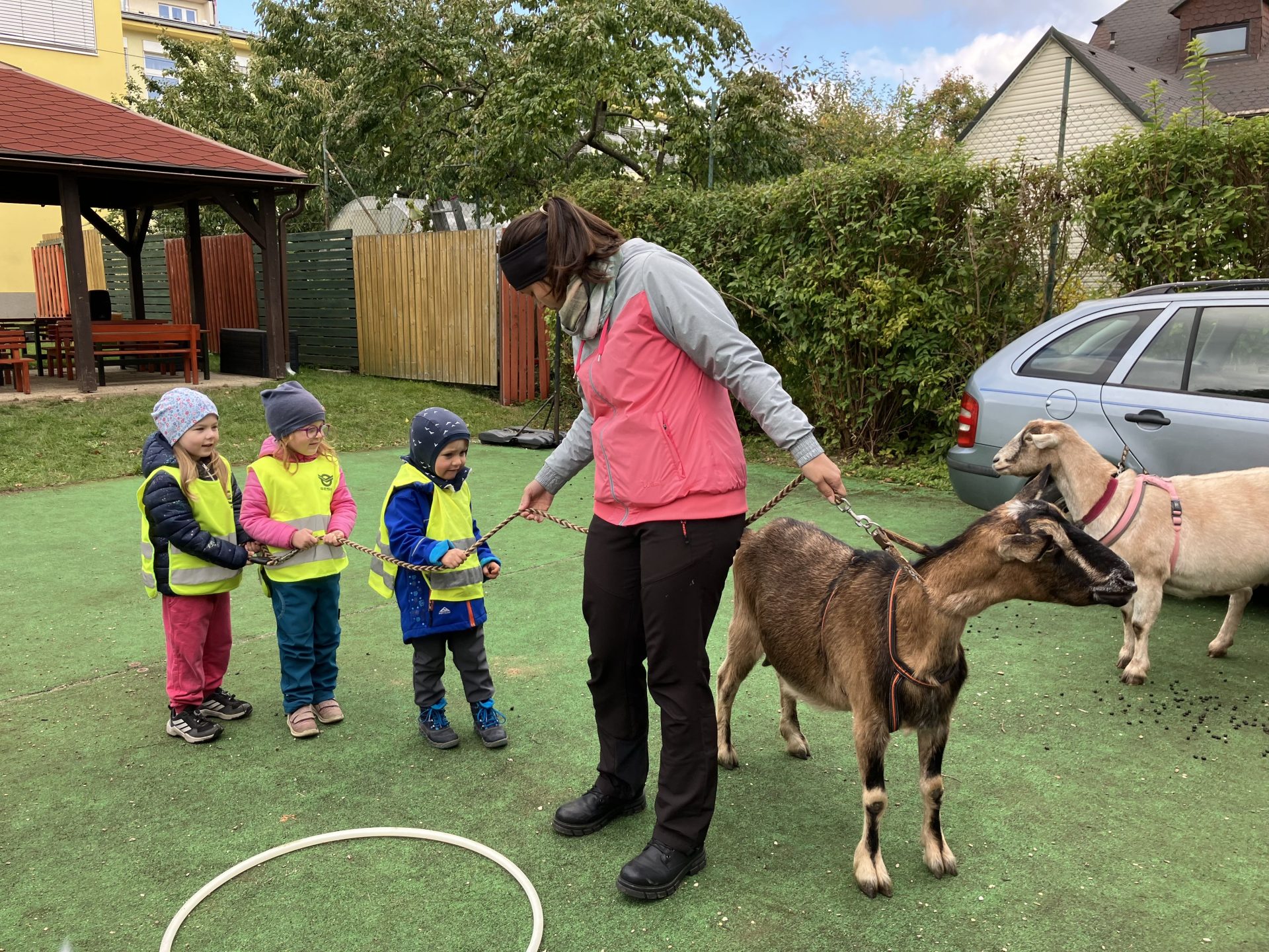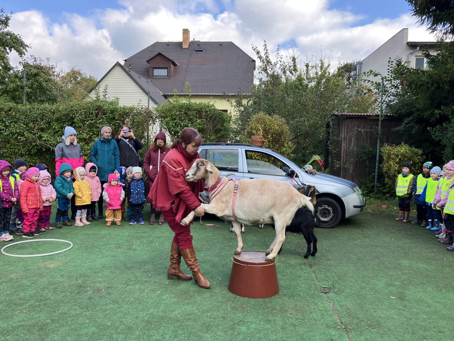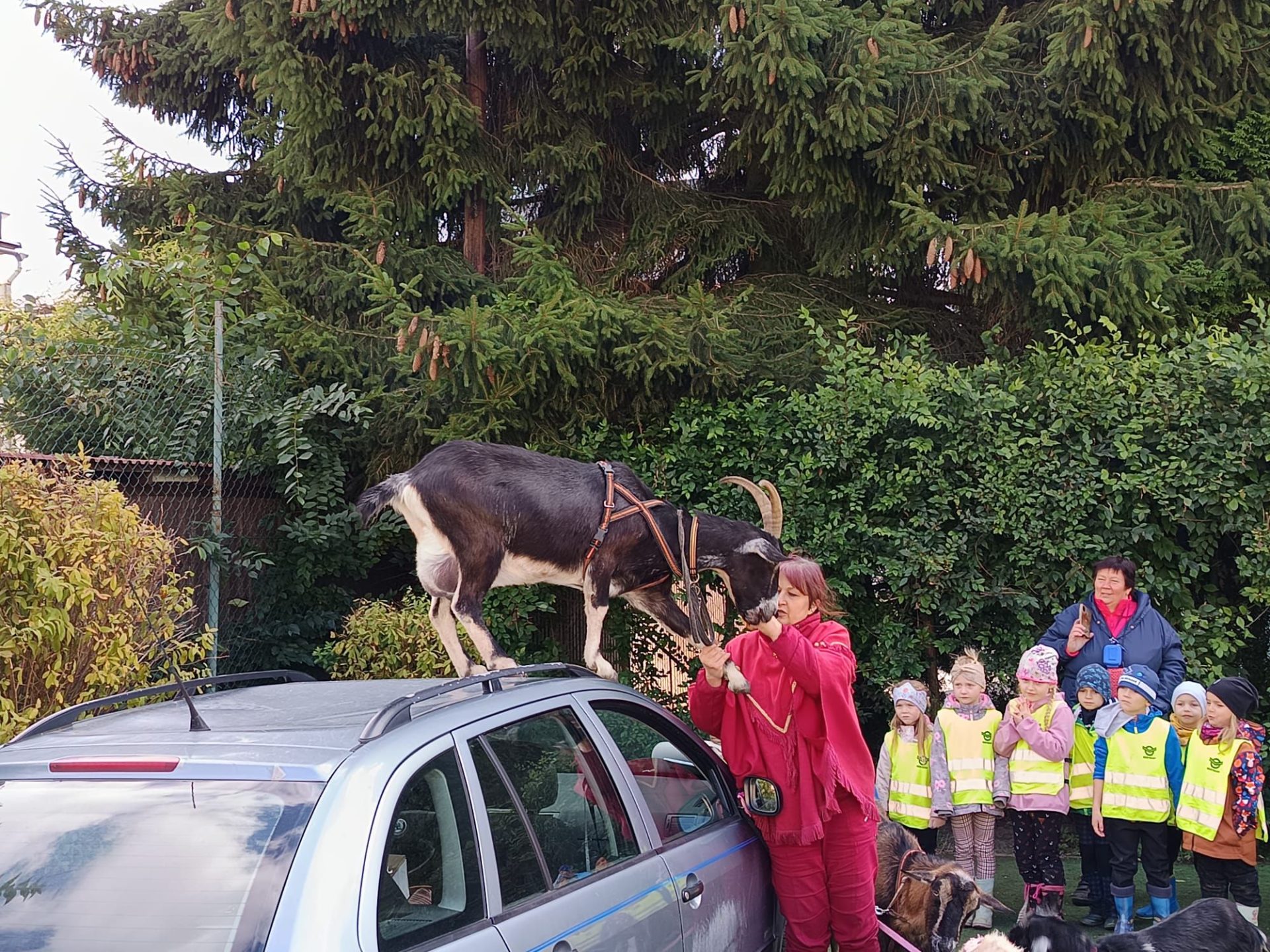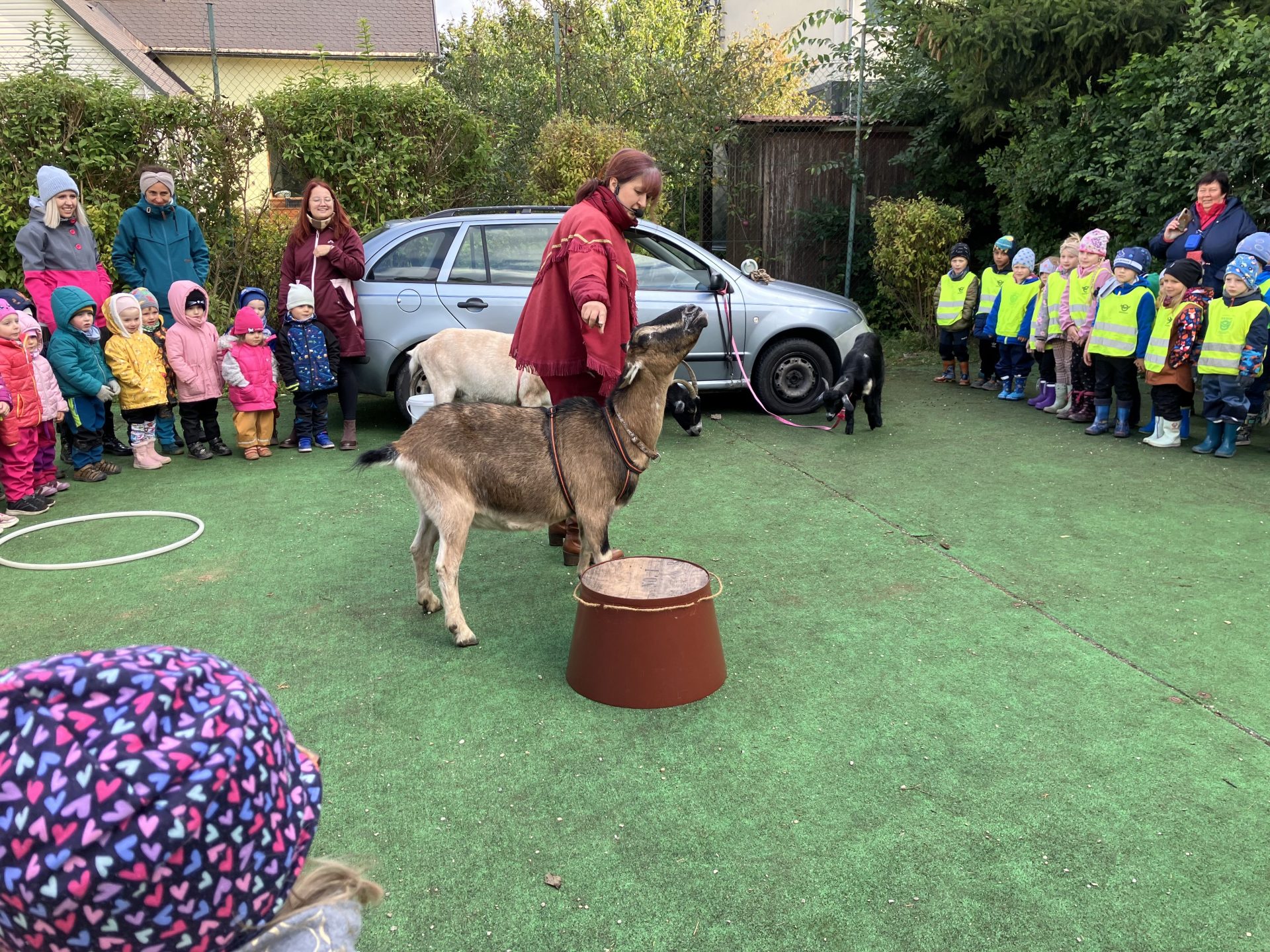 V tomto týdnu na zahrady mateřských škol zavítala zajímavá návštěva až od Uherského Hradiště. Z auta vystoupily čtyři kozy domácí: Julinka, která v roce 2013 zvítězila v soutěži Miss koza, Elenka, Reginka a nejmladší Zuzanka. Kozy jsou zcela socializované, jejich výcvik se podobá dogdancingu – tanci se psem.