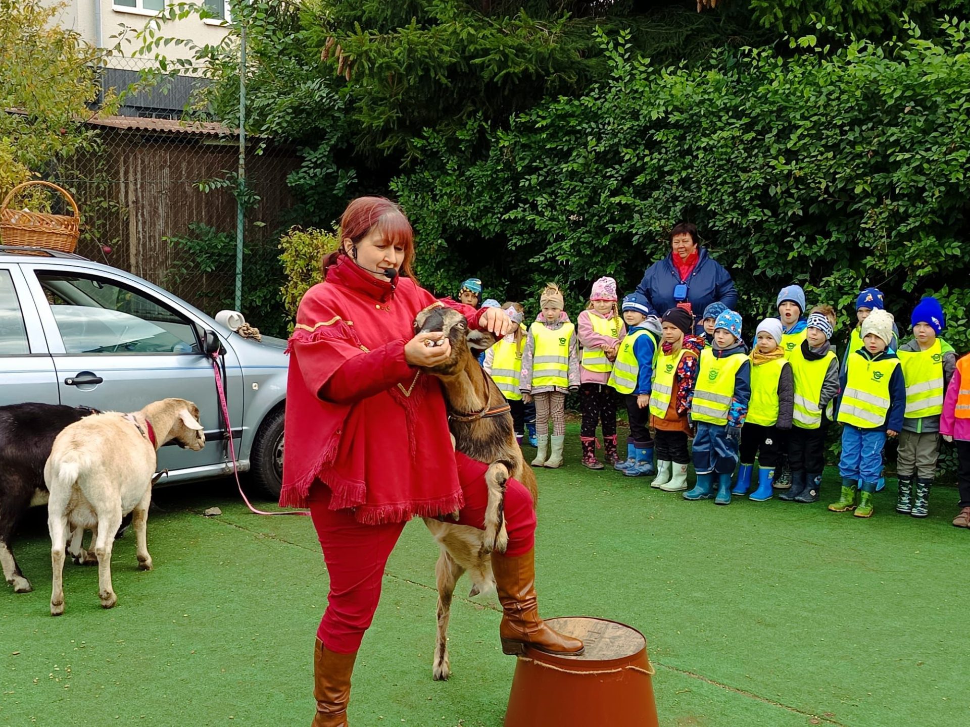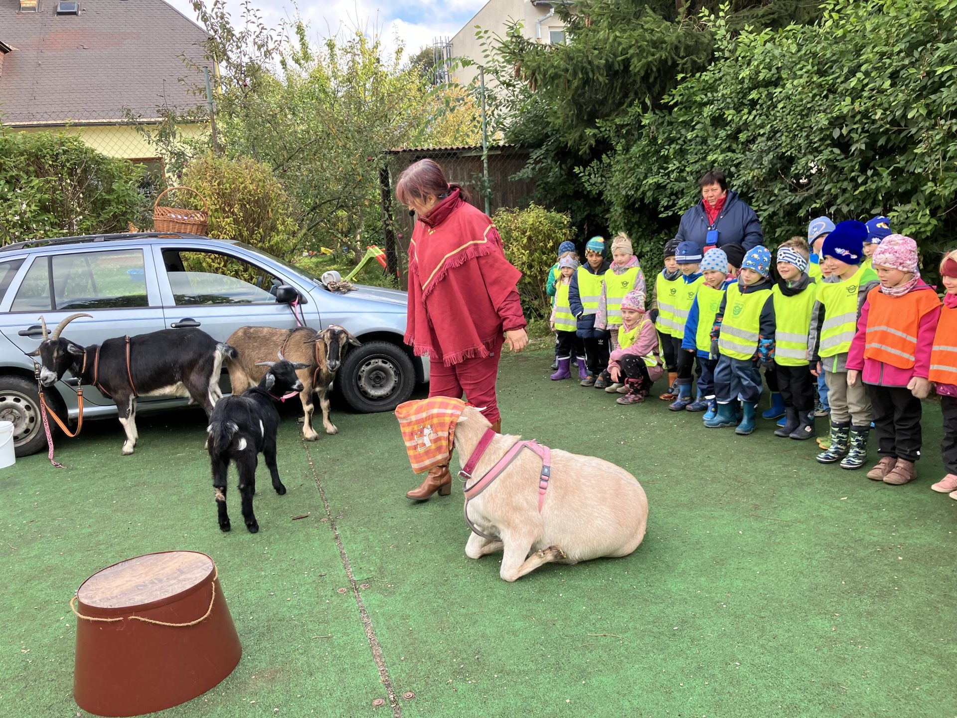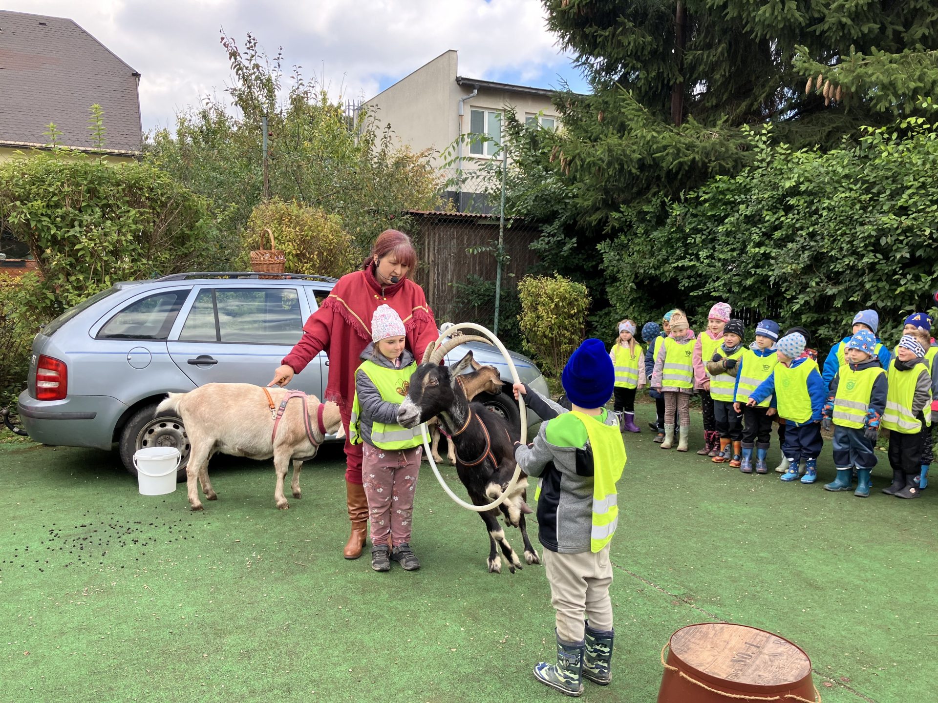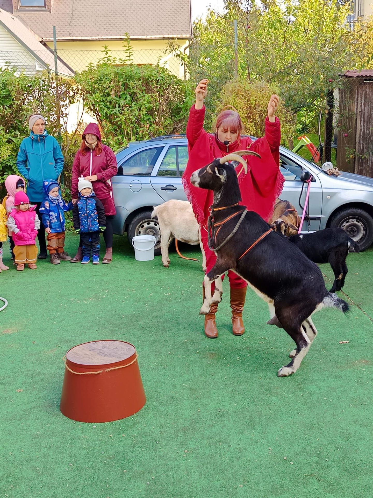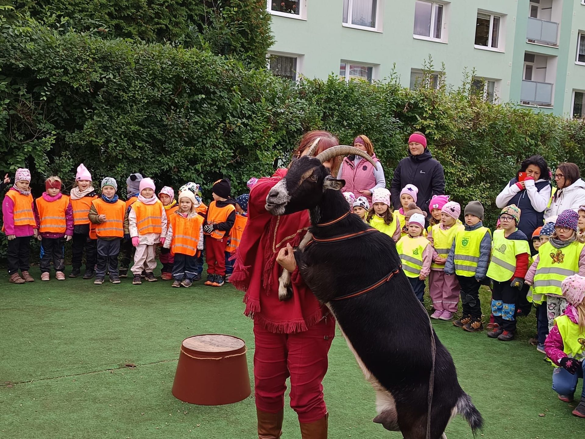 V tomto týdnu na zahrady mateřských škol zavítala zajímavá návštěva až od Uherského Hradiště. Z auta vystoupily čtyři kozy domácí: Julinka, která v roce 2013 zvítězila v soutěži Miss koza, Elenka, Reginka a nejmladší Zuzanka. Kozy jsou zcela socializované, jejich výcvik se podobá dogdancingu – tanci se psem.