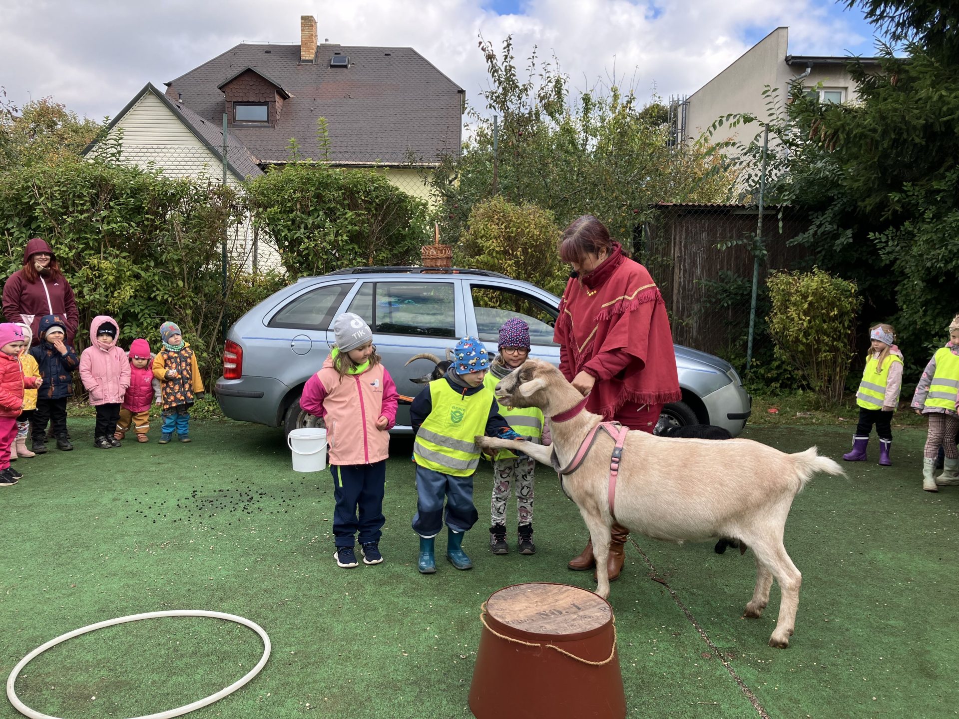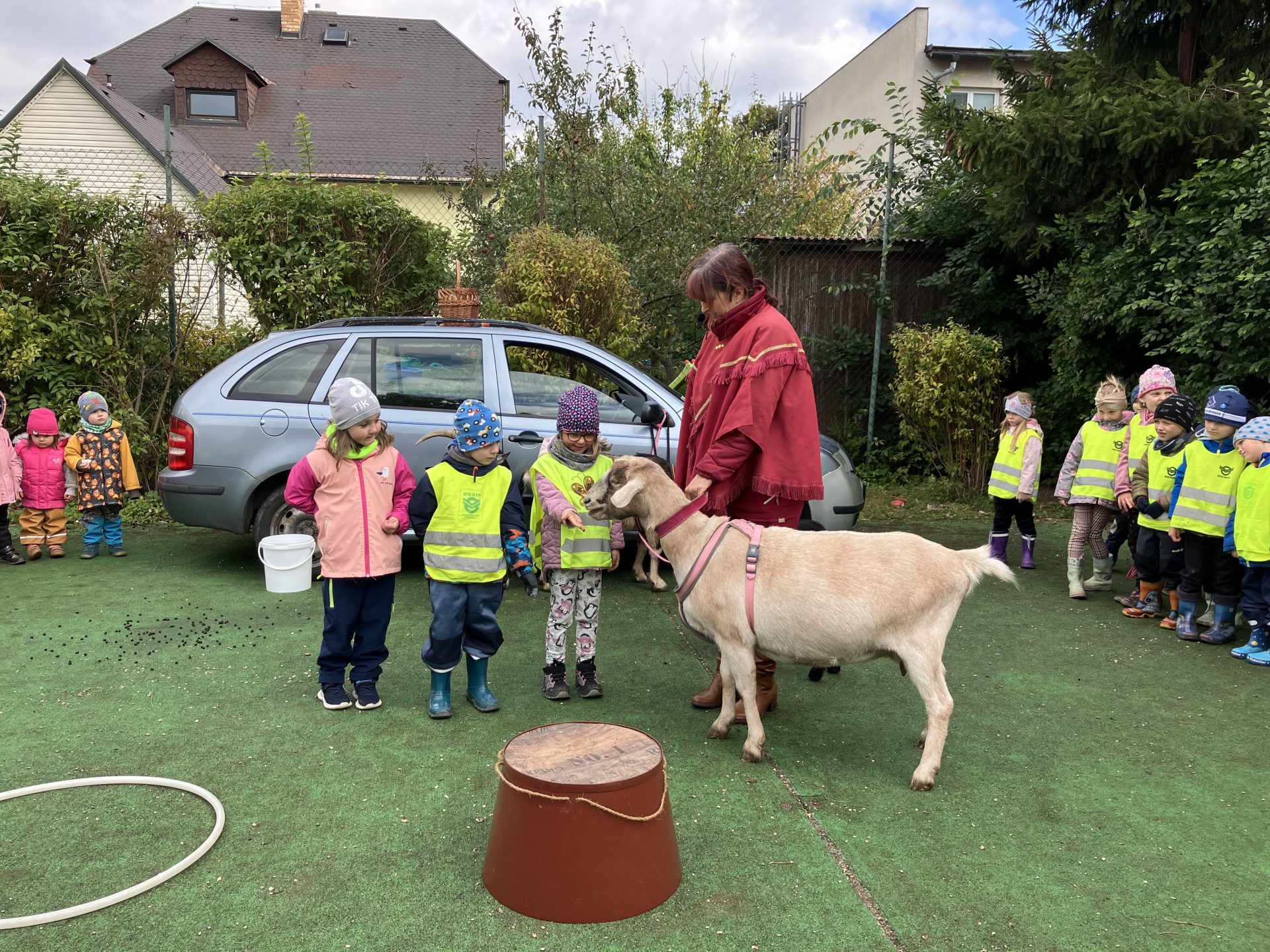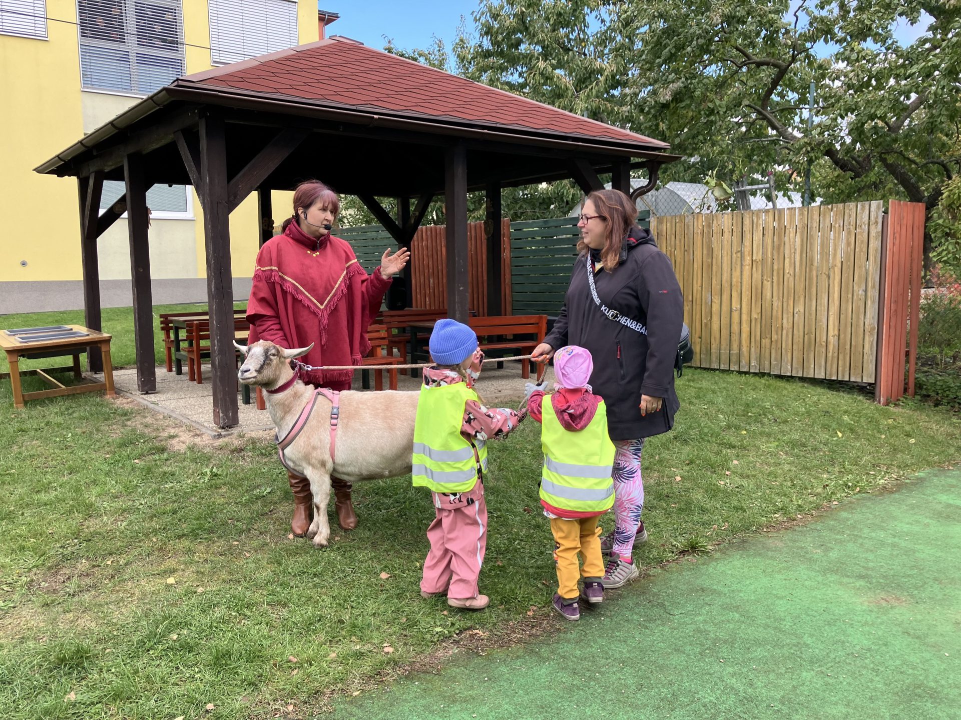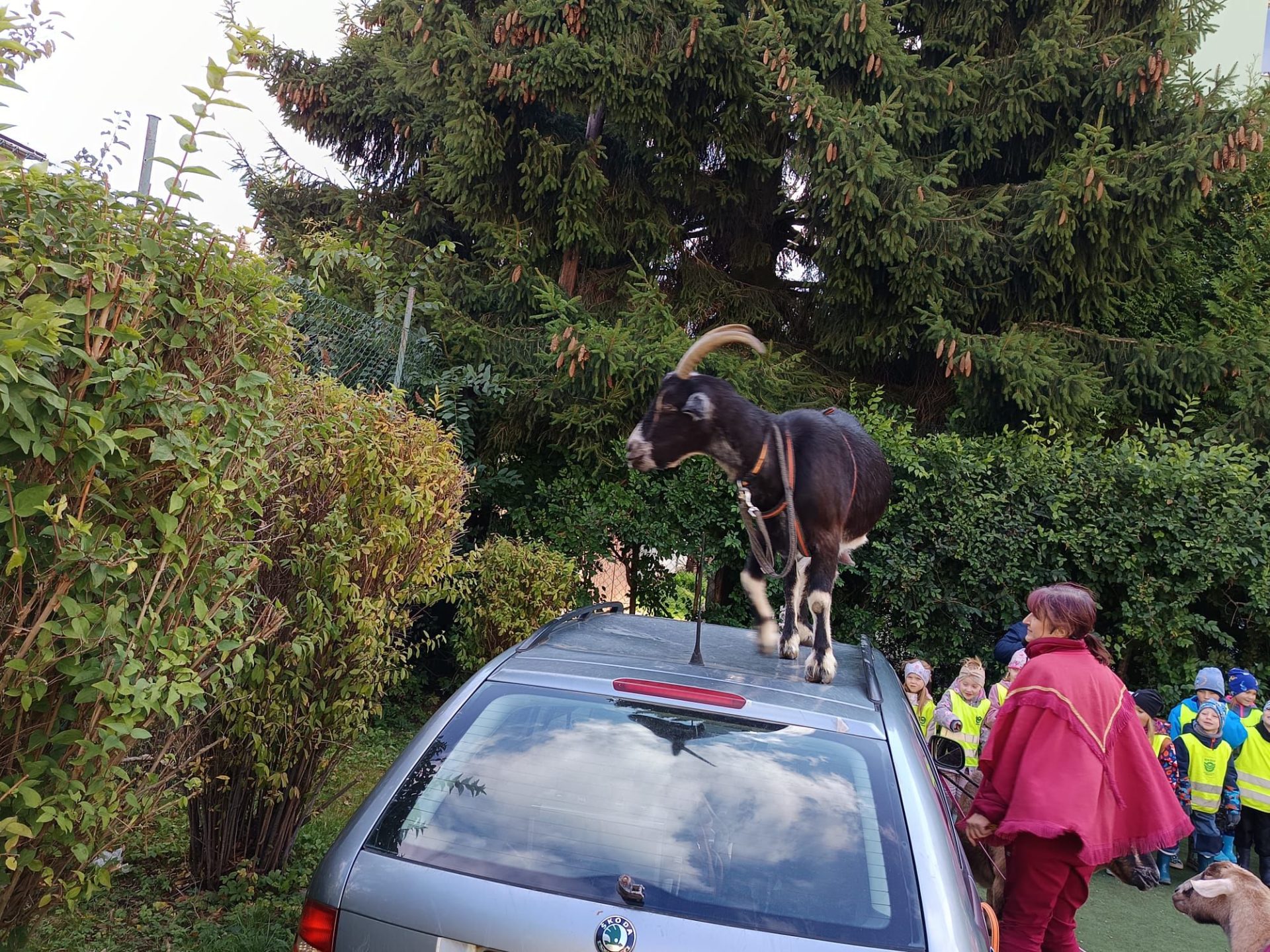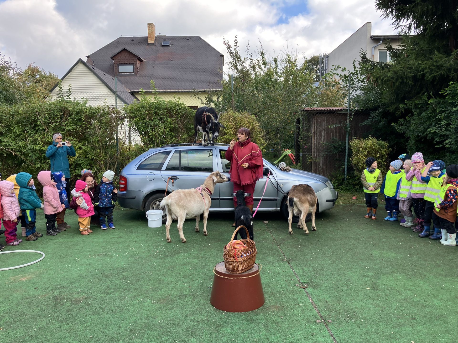 V tomto týdnu na zahrady mateřských škol zavítala zajímavá návštěva až od Uherského Hradiště. Z auta vystoupily čtyři kozy domácí: Julinka, která v roce 2013 zvítězila v soutěži Miss koza, Elenka, Reginka a nejmladší Zuzanka. Kozy jsou zcela socializované, jejich výcvik se podobá dogdancingu – tanci se psem.