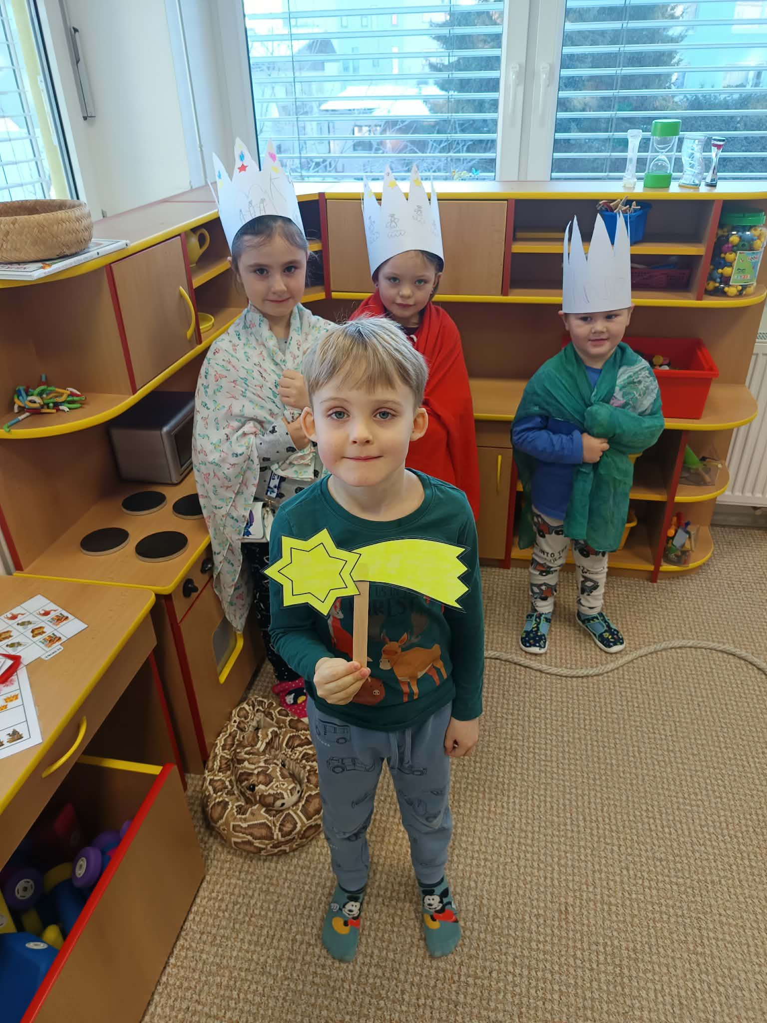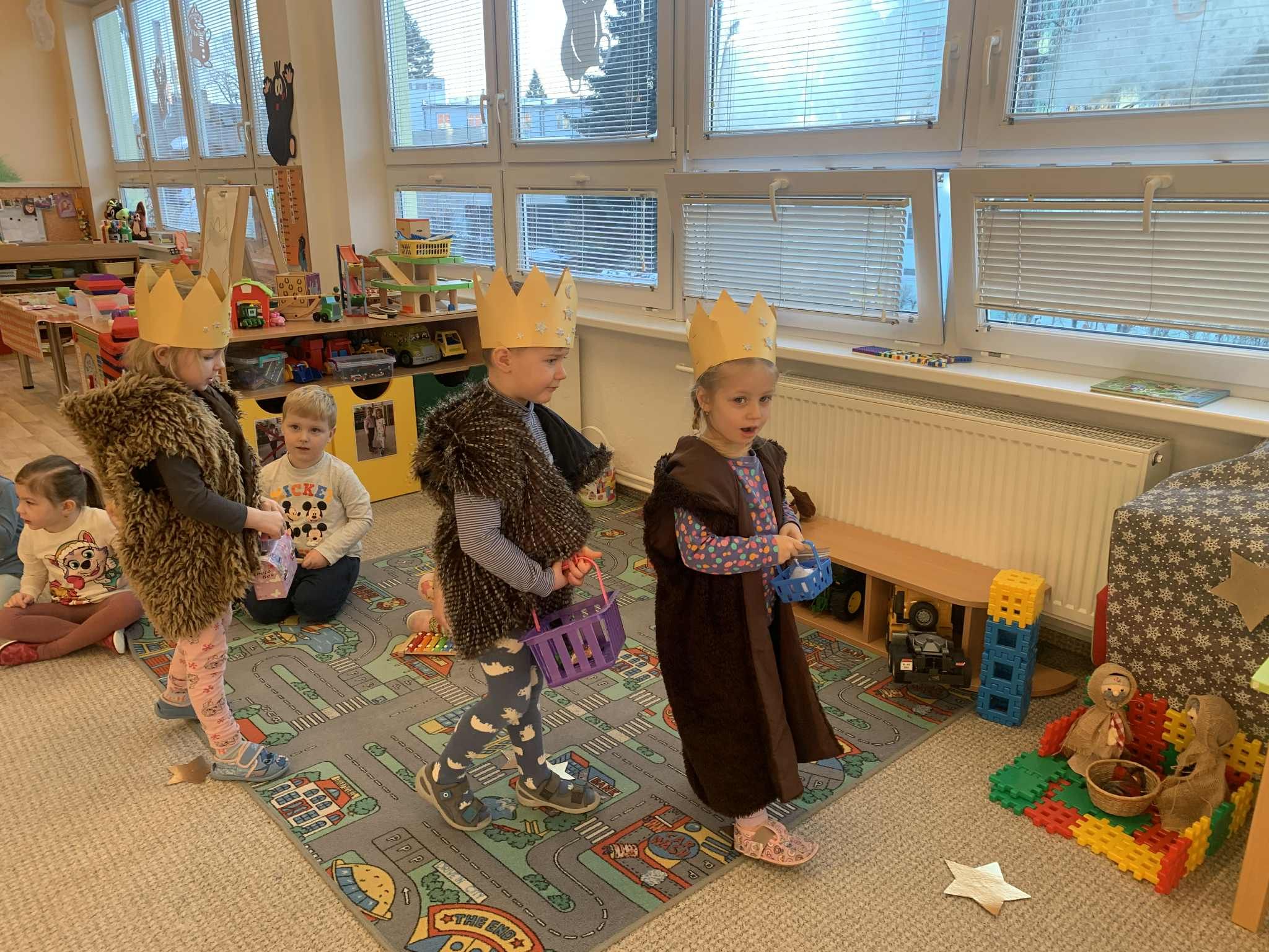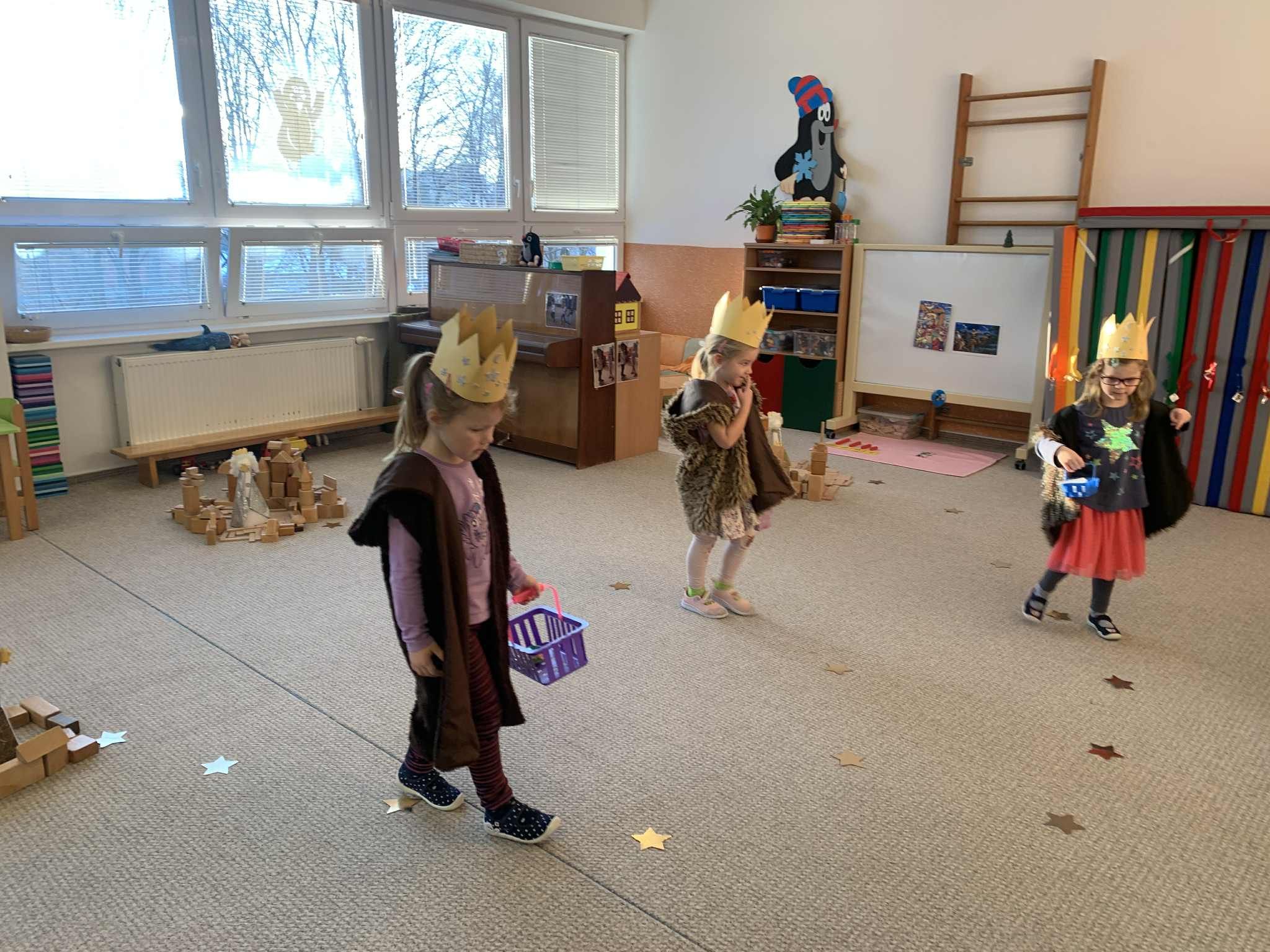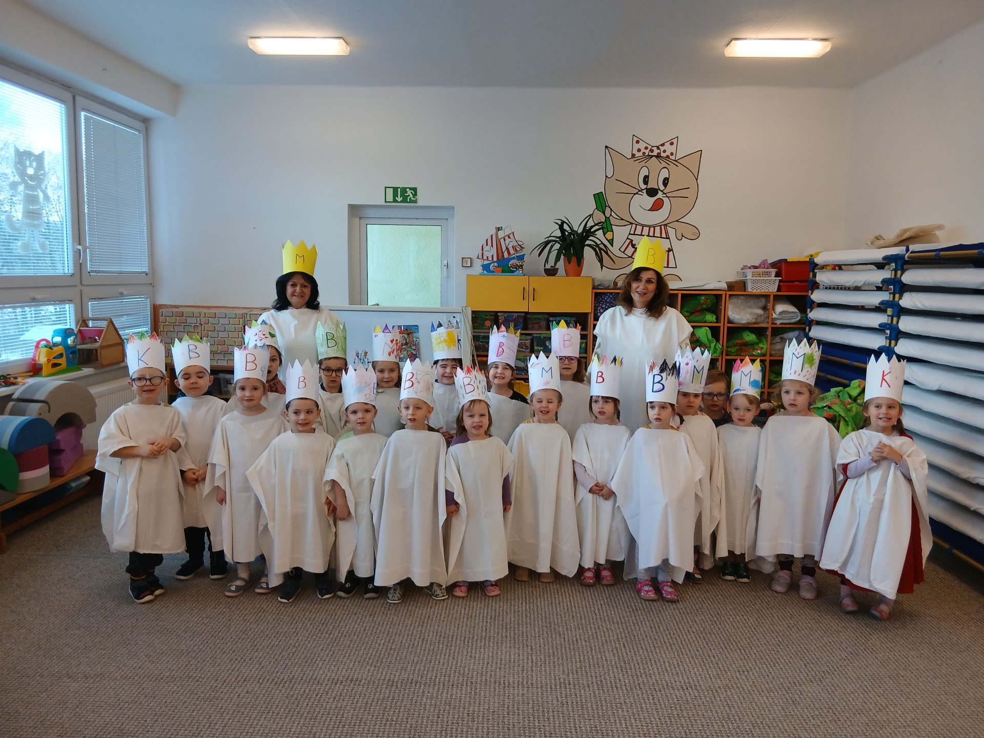 Vánoce utekly jako voda a my jsme se opět sešli v mateřské škole. Začátek nového roku se v naší škole nesl v duchu lidové tradice – Tří králů. Děti se pomocí her, příběhů a výtvarných aktivit seznamovaly s putováním králů a jejich jmény. Během celého týdne se děti učily zpívat koledu, kterou jsme si během koledování po mateřské škole společně zazpívali.